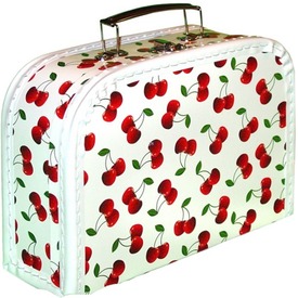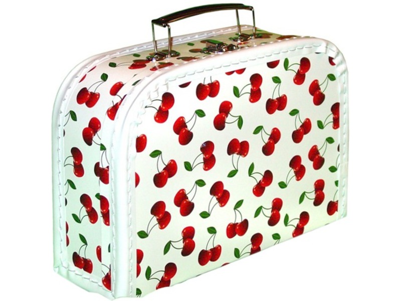 Cseresznye óvodás bőrönd A Fehér cseresznyés kis bőrönd leírása: Kemény kartonból készült, varrott műbőr szegélyű bőrönd, fém foganytúval és csattal. A bőrönd fehér színű és cseresznyékkel van díszítve. Tárold benne kedvenc játékaidat, amiket a bőrönd segítségével bárhova magaddal tudsz vinni. Méretek: 25 x 17 x 9 cm.