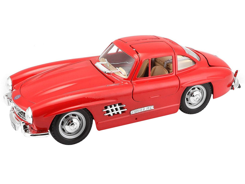 Az ikonikus Mercedes Benz 300SL piros modellje a híres Burago márkától. Az 1:24 méretarányú részletes modell fémből készül, amelyet műanyag alkatrészek egészítenek ki. Az autónak nyithatóak az ajtajai, csomagtartója és a motorház teteje is egyaránt.