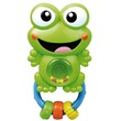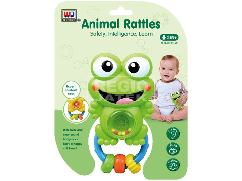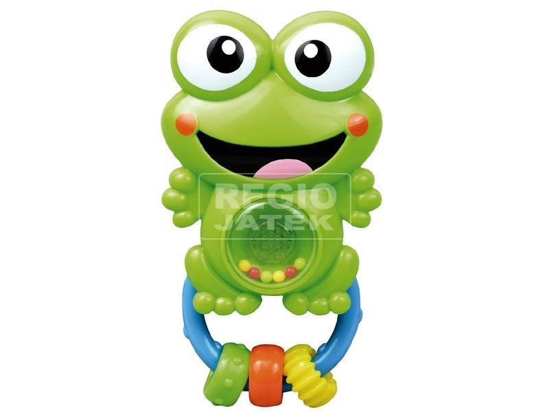 Pici, műanyag csörgő vigyorgó béka figurával! A Műanyag békás csörgő egy zörgő golyókkal töltött kis béka, akit fel lehet akasztani a babaágyra, babakocsira is. Ha a pici megrázza a békát, akkor az vidám, zörgő hangot ad ki magából. A műanyag békás csörgő játék közben világít, pocakja piros fényt ad ki magából. A játék 4 db LR44 gombelemmel működik, a csomagolás az elemeket nem tartalmazza. Méretek: 8 x 14 x 3 cm.