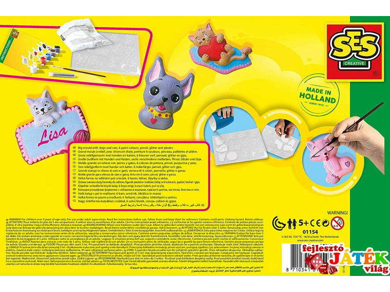 Formázz gipszből cicás vagy kutyás szobrokat, ajándéktárgyakat! A SES Kutyák és cicák 3D gipszkiöntő készlet különböző öntőformákat, festéket, csillámot és gipszet rejt magában, amikkel különféle apró gipsztárgyakat tudsz kiönteni. A formákból összesen 12 figurát tudsz elkészíteni, köztük táskás kutyát, vagy nyújtózó cicát is. Keverd el a port kevés vízzel, majd öntsd a formába, simítsd el az alját! Ezután hagynod kell száradni a gipszet, és ha végül kiborítod az öntőformából, egy élethű kutya vagy cica marad a végeredmény! A Kutyák és cicák 3D gipszkiöntő készletben lévő festékekkel többféle színben is ki tudod festeni az elkészült állatokat.
