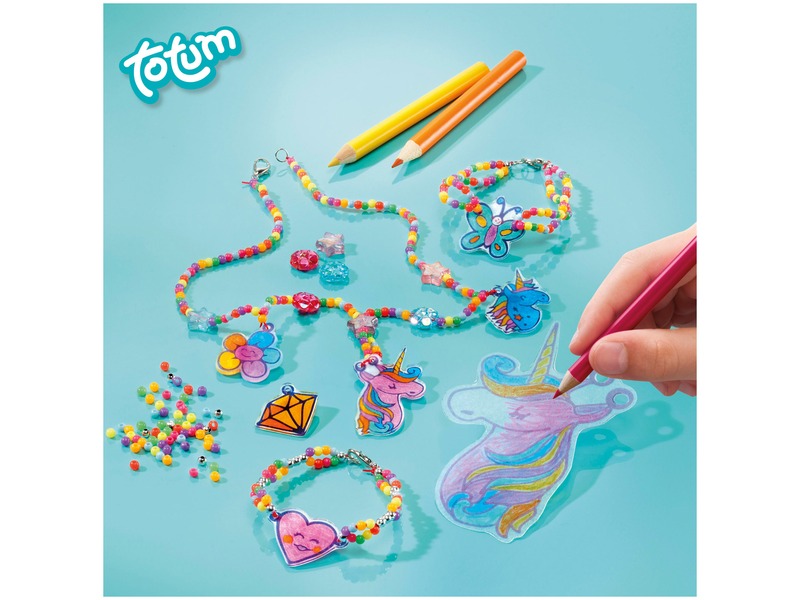 Gyárts nyakláncokat, karkötőket zsugorfólia felhasználásával! A Totum Fólia ékszer készítő készlettel hőre zsugorodó fóliákból tudsz készíteni medálokat, amiket madzagra tudsz fűzni, gyöngyök és ékkövek mellé. Először rajzold meg a medálok mintáját, ezután húzd rá a fóliát, és tedd a medálokat a sütőbe pár percre, hogy a fólia összezsugorodjon a hő hatására. Közben fel tudod fűzni a madzagokra a gyöngyöket, végül pedig akaszd rá a medált, hogy elkészüljenek az ékszerek! A Fólia ékszer készítő készlettel barátság karkötőket is alkothatsz!