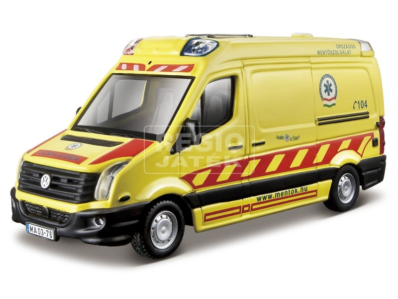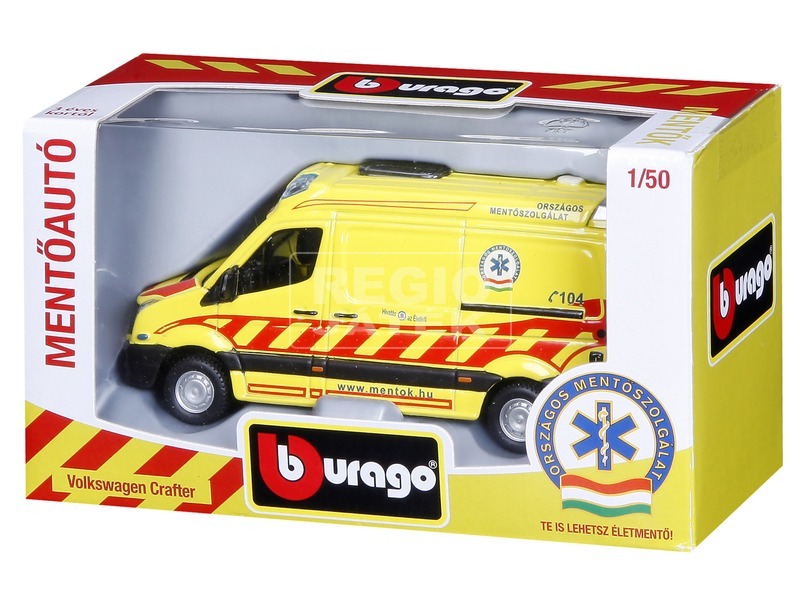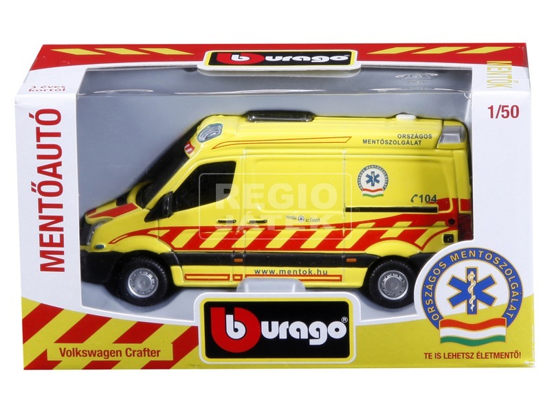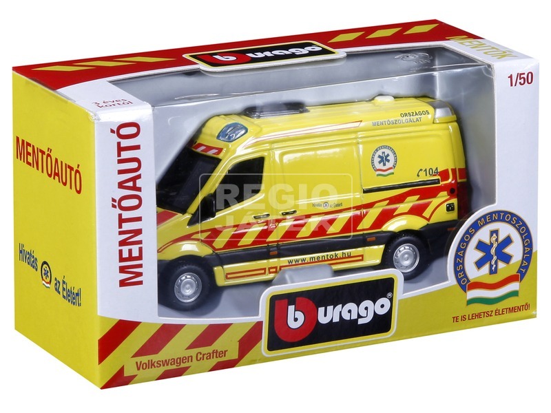 Bburago gyártmányú 1/50 méretarányú magyar mentőautó modell, amely az Országos Mentőszolgálat engedélyével készült. A modell a 2013-ban forgalomban lévő VW cratfer esetkocsik eredeti licence alapján készült. Az autó mellé elsősegély-könyvjelzőt is csomagoltunk a jövő életmentőinek.