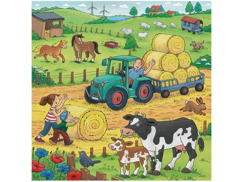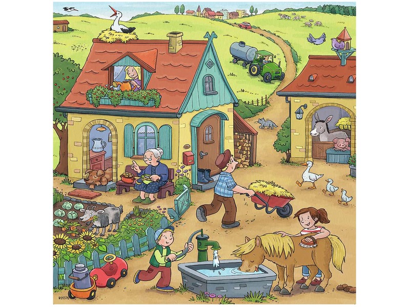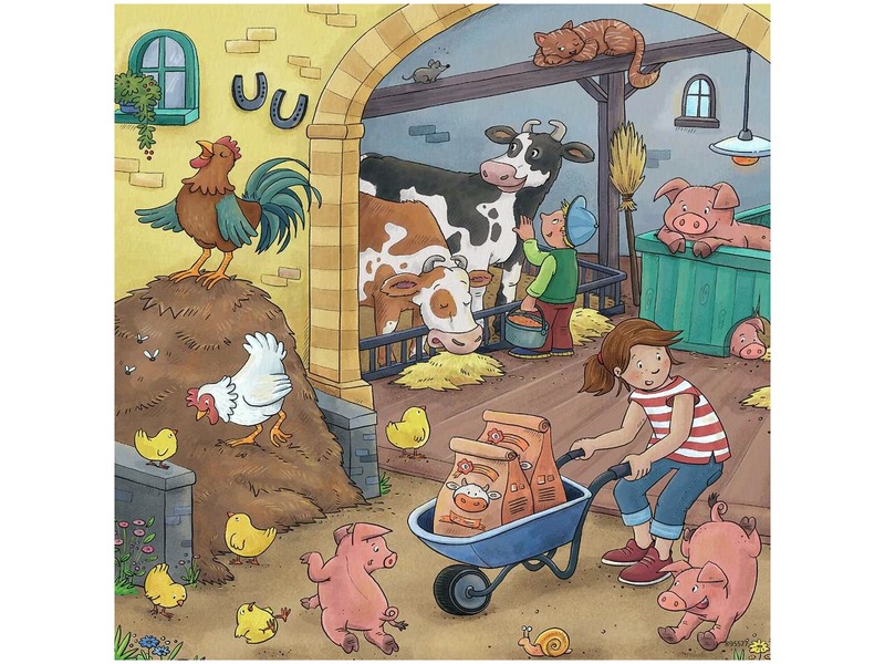 A Ravensburger 3x49 db-os Élet a farmon puzzle remek kikapcsolódás és koncentráció fejlesztő elfoglaltság akár az egész család számára, vagy csak önmagunk szórakoztatására. Az összerakott puzzle mérete 21 cm x 21 cm. A kirakót 5 éves kortól ajánljuk.