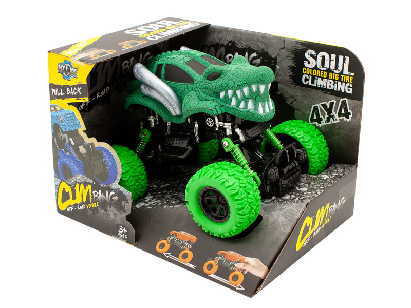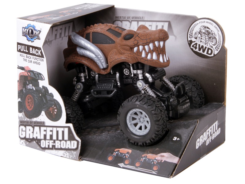 Hüllő karosszériás terepjáró autó, négy kerekes meghajtással! A Graffiti Off-Road terepjáró egy ijesztő dinoszauruszt, vagy állatot mintázó járgány, rugós felfüggesztéssel, műanyag karosszériával. Az autó hátrahúzós meghajtással készült, ha visszahúzod, majd elengeded, magától elindul, felgyorsul és messzire fog gurulni. A Graffiti Off-Road terepjáró vagány megjelenésű, és bármilyen akadályon könnyedén átgurul. Az autó méretei: 17 x 11 x 12 cm. A játékok külön kaphatóak.