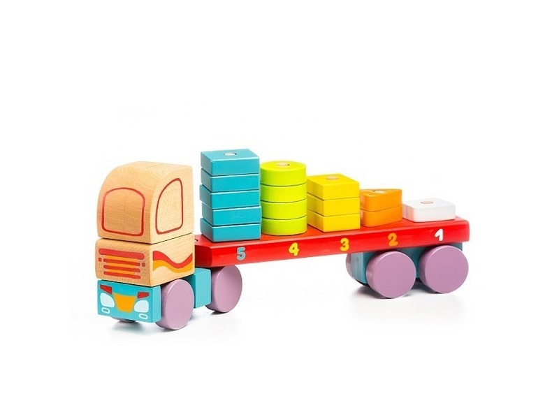 Fuvarozz színes építőelemeket a fa kamionnal! A Fa kamion fakockákkal egy színes, utánfutóval készült kamion, amin különböző színű formákat tudsz csoportosítani. A formák között háromszöget, kört és négyzetet is találsz, amiket a platón lévő tüskékre kell felhúzni. A kamionnal a számokat, a színeket és a formákat is meg tudod tanulni, játék közben még a kézügyességed is látványosan fejlődik. A Fa kamion fakockákkal méretei: 32 x 5 x 12 cm.