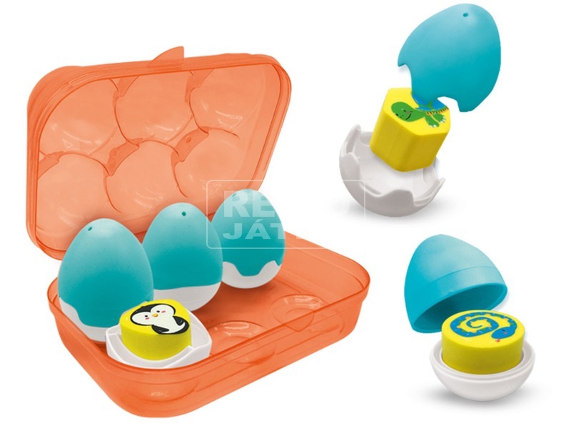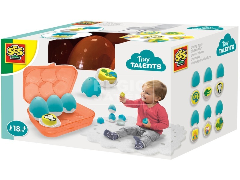 Ismerkedj meg az állatokkal és az őket ábrázoló formákkal! Az első tojásválogatóm SES játékkészlet nagyszerű lehetőséget biztosít, hogy szórakozató módon fedezd fel a körületted lévő világot. A tojáshéjba rejtett játékok megtalálása biztosan nagy örömükre fog szolgálni minden kis felderítőnek. Nyisd fel a tojásokat és ismerd meg legújabb játékformáidat! A kockákon különböző állatokat találhatsz, kígyó, krokodil, csibe, teknősbéka, pingvin és bagoly alig várja, hogy különböző kalandokat éljenek át veled. A tojástartó és a tojás alakú tároló formák segítenek, hogy könnyebben rendszerezni tudd játékaidat és mókás megjelenést biztosítanak, lakásod díszeként. Szórakoztató és aranyos formáknak köszönhetően pedig bármilyen környezetben feltalálhatod magad. Nyisd ki a tojásokat és élvezd a velük töltött játékélményt! A készlet tartalmaz 1 db műanyag tojástartót, 6 db műanyag tojást és 6 db fakockát, különböző állatfejekkel díszítve.