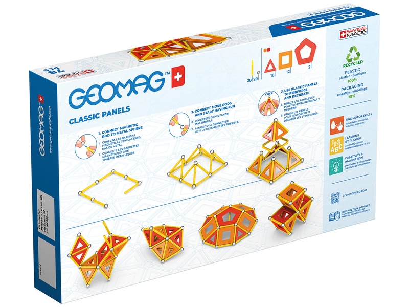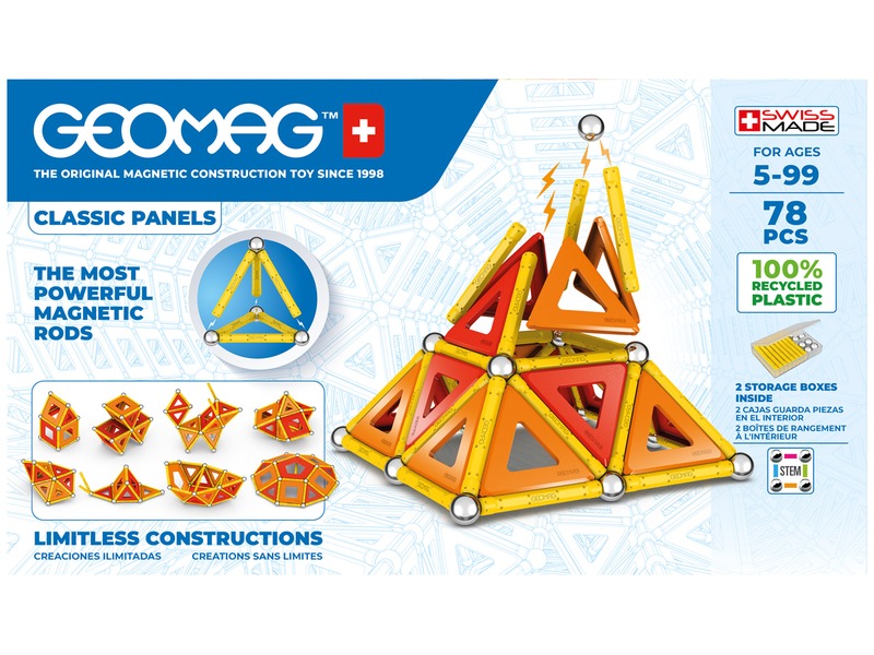 Gondolkodj és építs lenyűgöző alakzatokat! A Geomag Classic Panel narancs, citromsárga és piros színével fogja beindítani a kobakokat! A játék során a mágneses rudakkal, acélgömbökkel és a különböző alakzatú panelekkel leszel képes épületeket és formákat alkotni. A mágnesesség hatására a részek összekapcsolódnak, így egyre gyorsabban leszel képes haladni munkálataid során. A játék 100%-ban újrahasznosított műanyagból készül, emellett az elkészítéséhez megújuló energiaforrásokat használnak, így a nagy építkezések során a gyermekek a környezettudatosságról is tanulhatnak. Használd kreativitásod és térlátásod, hogy különböző alakzatokat és fantasztikus építményeket hozhass létre akár szobád padlóján vagy egy asztalnál üldögélve! A Geomag Classic Panel 78 db elemből készlet tartalmazza a mágneses rudakat, acél gömböket és a három-, négy-, ötszögű paneleket. Az építőjátékot 6 éves kortól ajánljuk.