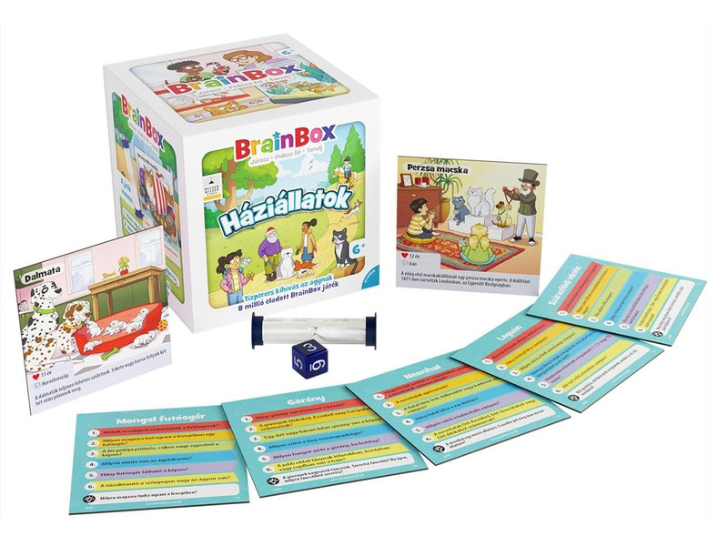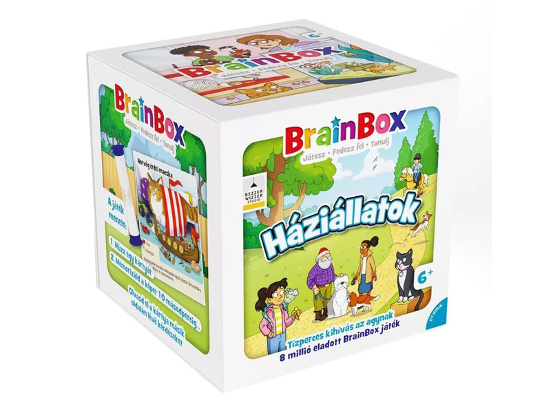 A BrainBox – Háziállatok egy szórakoztató és tanulságos memóriajáték, amely játékos módon ismerteti meg a gyerekeket a házi kedvencekkel és haszonállatokkal. A játék során a résztvevőknek 10 másodperc áll rendelkezésükre, hogy alaposan megfigyeljék a kártyán található képeket és információkat, majd ezt követően kérdésekre válaszolva tesztelhetik emlékezetüket és figyelmüket.