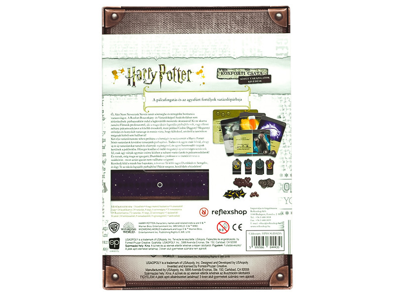 Légy Te is a Roxford tanulója és hívd ki diáktársadat egy párbajra! A Harry Potter Sötét varázslatok kivédése társasjátékkal most saját bőrödön tapasztalhatod meg a varázslás erejét. A társas két fő játszhatja, hiszen egy párbajról van szó. A játék során kártyák felhúzásával kezdhetitek el egymást megtámadni. Különféle lapok felhúzásával tudjátok magatokat egyre erősebbé tenni és az ellenfeleteket kijátszani, ilyenek a szövetséges lapok, varázslatok, különféle tárgyak és az átokkártyák. A játékot természetesen az nyeri, aki a párbajban győzedelmeskedik ellenfele fölött. A párbaj időtartalma maximum 1 óra, így akár visszavágót is játszhattok a revans érdekében. Tökéletes választás lesz a társasjáték a nagysikerű Harry Potter filmsorozat kedvelői számára. Hívd ki barátaidat egy varázs párbajra és döntsétek el ki az legügyesebb tanonc a Roxfordban! A Harry Potter Sötét varázslatok kivédése társasjáték tartalmazza a táblát és a további kiegészítőket. A játék mérete 22,5 x 15,2 x 63,5 cm.