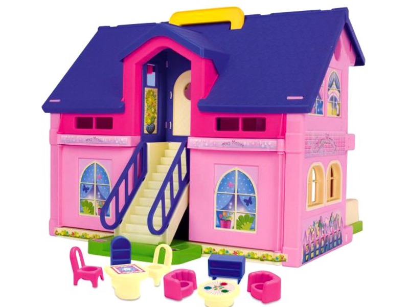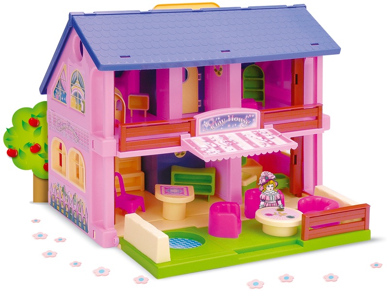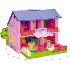Kétszintes rózsaszínű babaház ülőgarnitúrával, kültéri-beltéri bútorzattal, terasszal ideális babajátékokhoz. Ajánlott korosztály: 3 éves kortól.