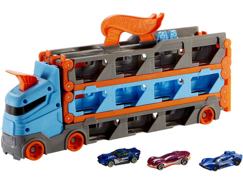 A Hot Wheels újradefiniálja az autók tárolását és a versenyzést egy nagyon klassz, meglepetésekkel teli kamionban. Az utánfutón lévő kis ablakok bemutatják a több mint 20 autót, amelyet szállítani képes, és amikor a gyerekek meghúzzák a hátsó reteszt, a pótkocsi egy 180 cm hosszú versenypályává alakul át! A többfunkciós jármű három 1:64 méretarányú járművel érkezik, és akár 19 további (külön megvásárolható) jármű is elfér benne. Végtelen szórakozást biztosít a 4-8 éves gyerekek számára. A színek és a díszítések eltérőek lehetnek.