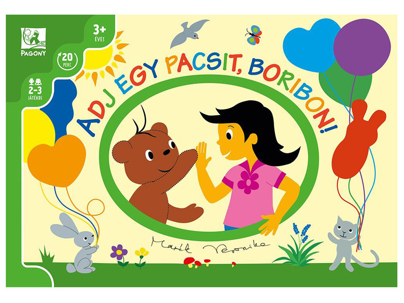 Elő a színes lufikkal és a dobókockával és kezdődhet a társasjáték a legkisebbek legkedvesebb mackó barátjával, Boribonnal! Vajon milyen feladat vár rád a lufik alatt? Marék Veronika népszerű maci figurája a mesekönyvek lapjai után most - a Pagony kiadó gondozásában - egy társasjátékon is megjelent és lufis kalandra hívja a gyerekeket, akár már 3 éves kortól! Egy igazán egyszerű és szeretetteljes családi társasjáték, amiben a gyerekek játékosan ismerkedhetnek a dobókockával és a számokkal, valamint a színekkel és a formákkal. Hiszen a színes táblán különböző formájú és színű lufik láthatóak, mindegyikben egy-egy kedves feladattal, ami kapcsolódásra hívja a játékosokat: “Adj egy pacsit!”, “Ölelj át!”, “Kérek egy puszit!”. A játék során 7 lufit kell összegyűjteni. Az “Adj egy pacsit, Boribon!” c. társasjáték az utóbbi idők egyik legjobb társasjátéka az óvodás korosztálynak. A játékot 2-3 játékos játszhatja és a becsült játékidő kb. 20 perc.