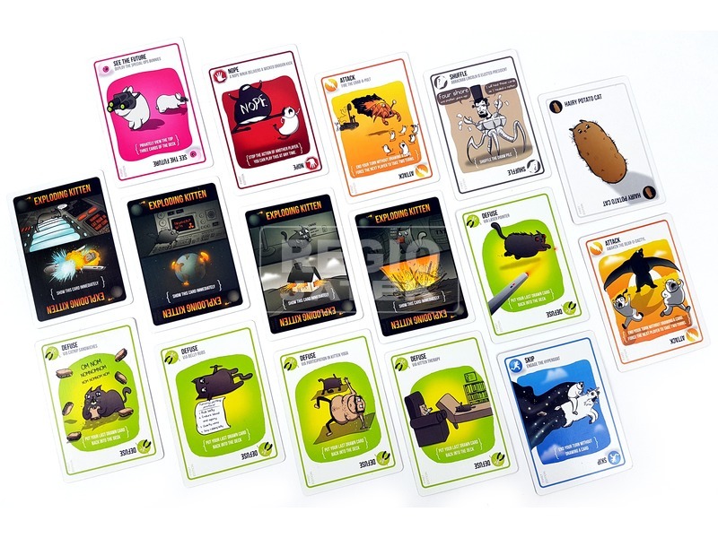Tereld el a robbanó macskák figyelmét a lézer mutatóval! A Robbanó cicák kártyajáték egy gyors és pörgős játék, ami nagyon hasonlít az orosz ruletthez. A játékosok lapokat húznak, és ha a robbanó cicát húzzák, kiesnek a játékból. Kivéve, ha van náluk lézermutató, macskamentás szendvics, vagy épp hasvakarás, mert akkor a cica figyelme elterelődik, és nem fog felrobbanni. A játékosok meg tudják viccelni egymást, és akár ki is tudják ejteni, a Robbanó cicák kártyajátékot az nyeri, aki utoljára bent tud maradni. Tartalom: 56 kártyalap, játékszabály.