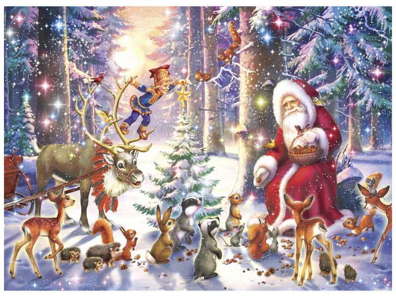 Hangulatos téli, erdei kép Mikulással és a kis erdei állatokkal.