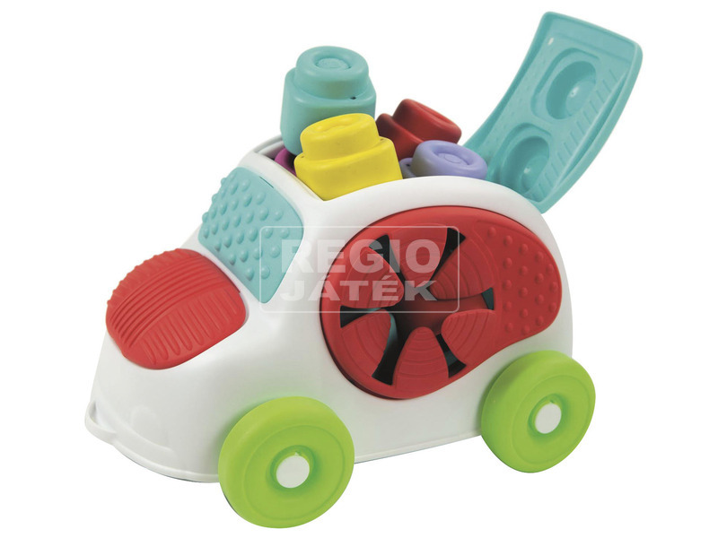 A műanyag Clemmy autó puha betétekkel, különböző stimuláló felülettel van ellátva, ez fejleszti a kicsik érzékelését. Az oldalsó elemek úgy vannak kialakítva, hogy a kockák átférnek rajta, így a kihúzásuk és bedugásuk fejleszti a kicsik kézügyességét.
