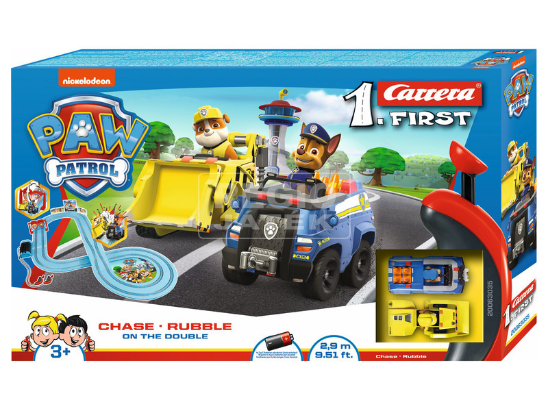 Legyél most te a leggyorsabb versenyző és ments meg a bajba jutottakat. A Mancs Őrjárat – Carrera FIRST autópálya jellemzői: - méretarány: 1:50. - a pálya hossza: 2,9 m. - a pálya mérete az összeállítás után: 114 × 88 cm. - analóg versenypálya rendszer. - a versenypálya működtetéséhez 4× C elem) szükséges. Az elemeket a készlet nem tartalmazza. - menetidő: akár 6 óra. - A készlet tartalma: - 1× autó Mancs Őrjárat Chase. - 1× autó Mancs Őrjárat Rubble. - egyenes szakasz. - kanyarelem. - 2× forgó kapu a szórakoztatóbb vezetésért. - 1× pályakötőelem. - 2× sebességszabályozó. - támaszok, palánkok, használati útmutató.