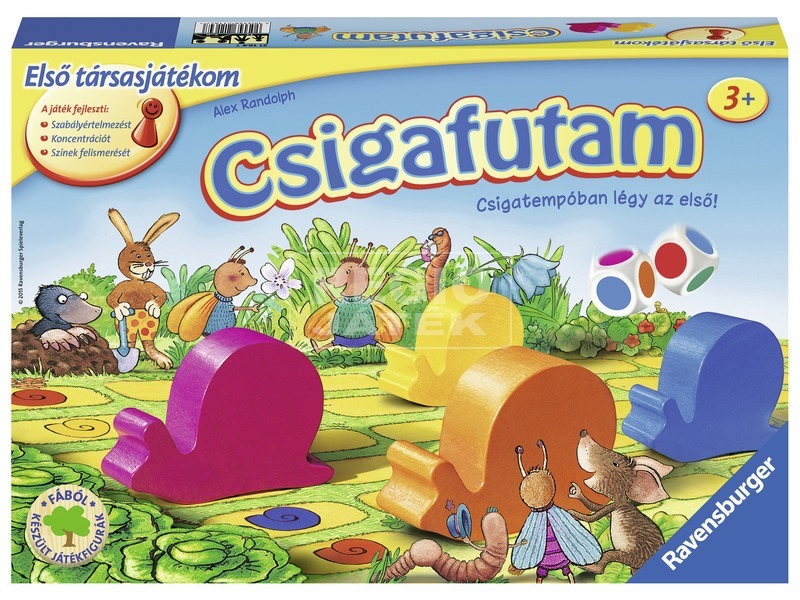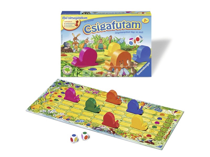 A Ravensburger „Csigafutam” társasjátékban bármi megtörténhet, még az is, hogy futóversenyt rendeznek a lassan araszoló csigák. Az egyszerű játék szabályai a legkisebbek számára is könnyen elsajátíthatóak, az izgalmas játékban pedig bárki nyerhet, ha a szerencse mellé áll. A színes dobókockák segítségével araszolnak a csigák a cél felé, aki először beér, az lesz a győztes. Dobj, lépj, segítsd a csigád, hogy ő lehessen a leggyorsabb a tisztáson!