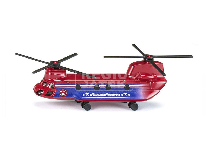 SIKU: Szállító helikopter Szállíts árut a helikopterrel. A SIKU szállító helikopter egy piros színű, két nagy rotorral felszerelt kék matricával ellátott szállító helikopter, ami kimondottan áruszállításra használható. A SIKU szállító helikopter modell két nagy rotorja forgatható, a raktér ajtaja lenyitható, így könnyen be tudod rakni az árut a helikopter rakterébe. A SIKU szállító helipkter modell használható más 1:87 méterarányú SIKU járművekkel, készletekkel. A helikopter mérete: 170 x 84 x 39 mm.