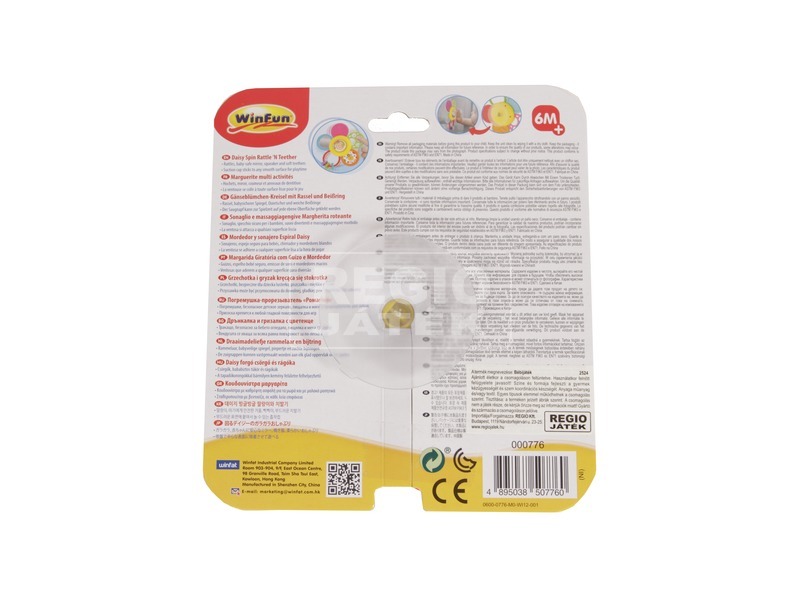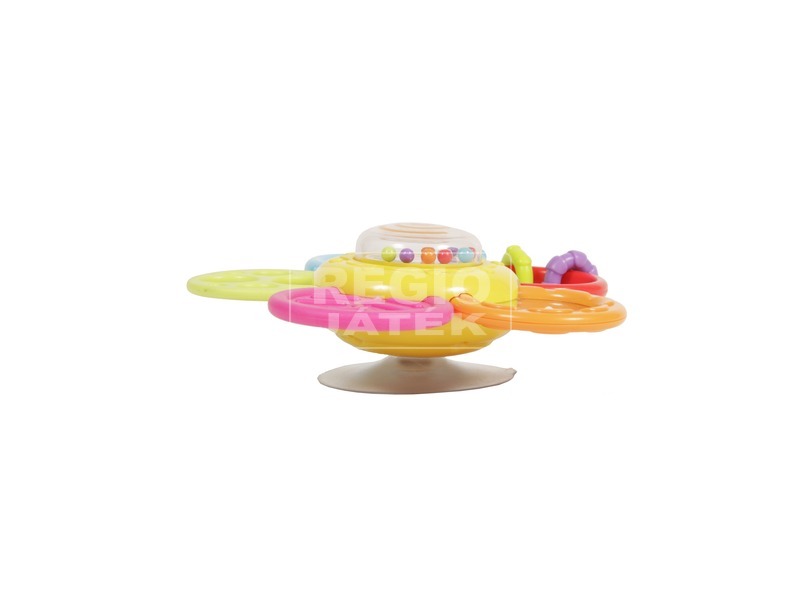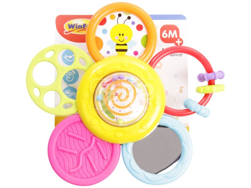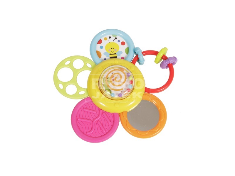 Pörgesd a vidám virágot, ami még zörögni is fog! A Virág alakú rágóka bébijáték egy műanyagból készült forgó virág, amit tapadókoronggal lehet sima felületre erősíteni. A virág minden szirma más-más meglepetést tartogat a picinek, a virágon tükör, csörgő karikák is találhatók. A játék rágókaként is használható, a közepét lenyomva a virág sípoló hangot ad. A Virág alakú rágóka bébijáték átmérője: 16 cm.