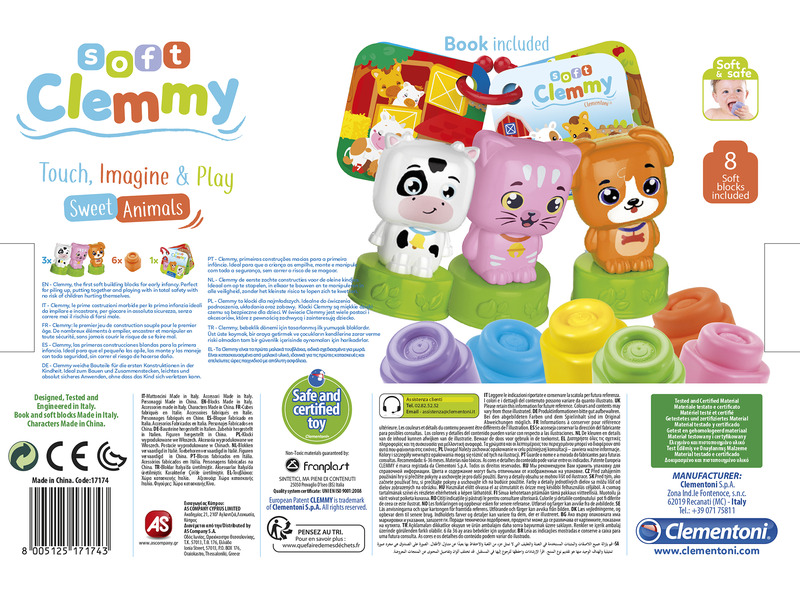 Állatos Clemmy játékkészlet, illusztrált kartonkönyvvel kombinálva. A gyerekek élvezhetik a játékot a kedves figurákkal, és a könyv segítségével sokféle történetet találhatnak ki, serkentve a képzeletüket, érzelmi kifejezőkészségüket és nyelvi készségeiket. A készlet a következőket tartalmazza: 6 db puha Clemmy építőkocka és 3 db figura. A puha Clemmy építőkockák segítenek a manuális és érzékszervi készségek fejlesztésében. A figurák és az építőkockák meleg vízben, semleges mosószerrel moshatók. A Clemmy építőkockákat Olaszországban fejlesztik, tervezik és gyártják.