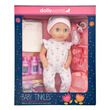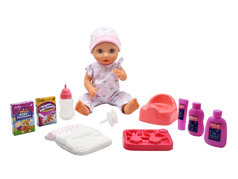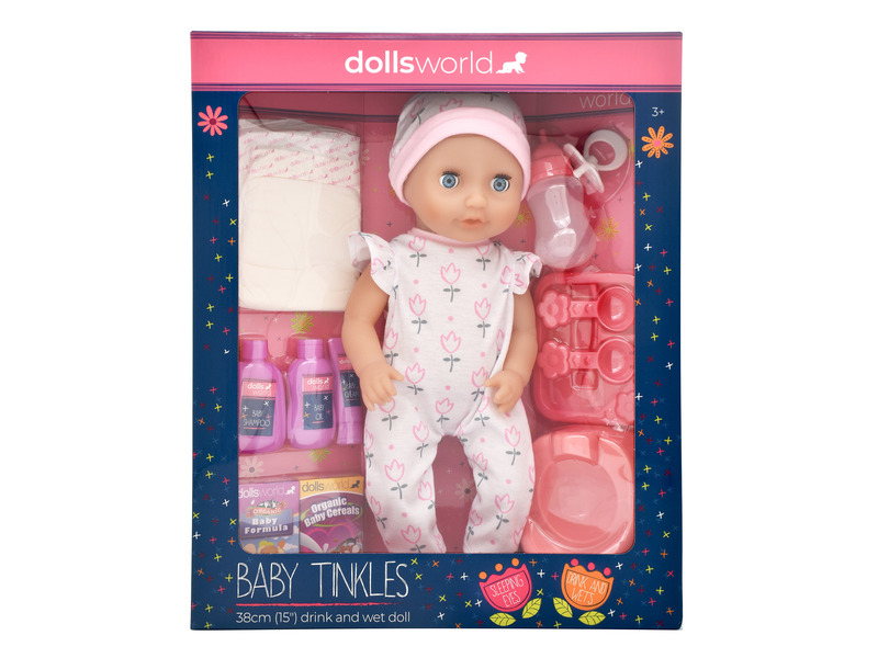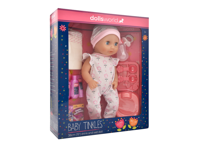 Etesd meg, altasd el és tedd tisztába Tinkles babát! A Baby Tinkles játékbaba kiegészítőkkel egy műanyagból készült játékbaba, akit ha lefektetsz, behunyja a szemeit. A baba karjai és lábai mozgathatók, a cumisüvegből meg tudod itatni, amit ki fog pisilni. A készlet bilit, tartalék pelenkát, előkét, cumisüveget, tápszereket, egy kis tálcát, evőeszközöket és babafürdető illatszereket is tartalmaz, a készlet együtt használható más Dolls World játékbabákkal is. A Baby Tinkles játékbaba kiegészítőkkel mérete: 38 cm.