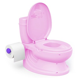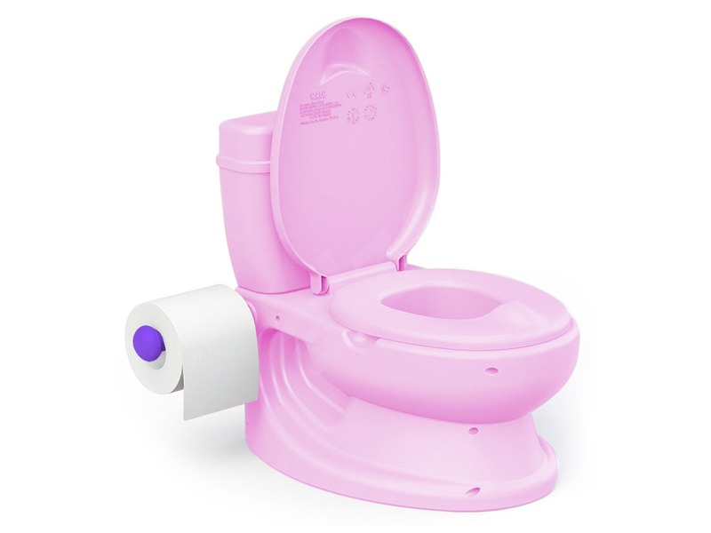 Szoktasd a picit a szobatisztaságra a rózsaszín vécével! A rózsaszín WC bili hanggal egy kényelmes, műanyagból készült tartályos WC, kivehető betéttel. A vécé tartályát játéktartóként tudod használni, amikor megnyomod az öblítő gombot, a WC hangot fog kiadni magából. A deszka és az ülőke lehajtható, a gyerekek könnyen rá tudnak szokni a használatára, ahogy utánozhatják a felnőtteket. A játék 3 darab LR44 gombelemmel működik, a csomagolás az elemeket tartalmazza. A rózsaszín WC bili hanggal méretei: 37 x 24 x 37 cm.