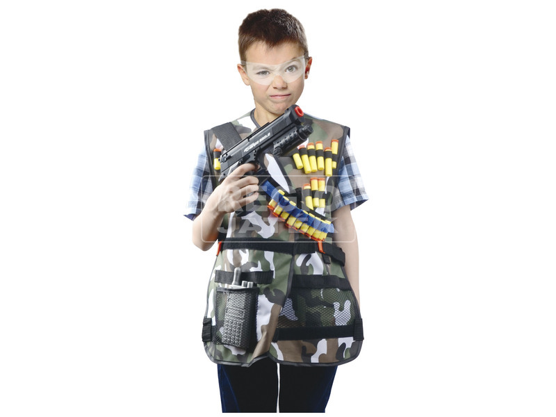 Ezzel a szettel igazi katonának érezheted magad. Vedd fel a katonamellényt, és rakd el a zsebekbe a telefont, amin a kapcsolatot tartjátok, a pisztolyt, amivel megvédheted magad, és a puha szivacslövedék tartalékot.