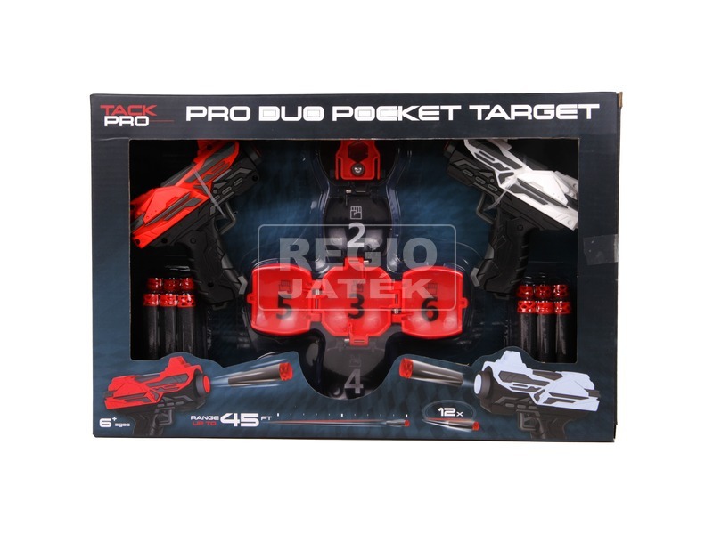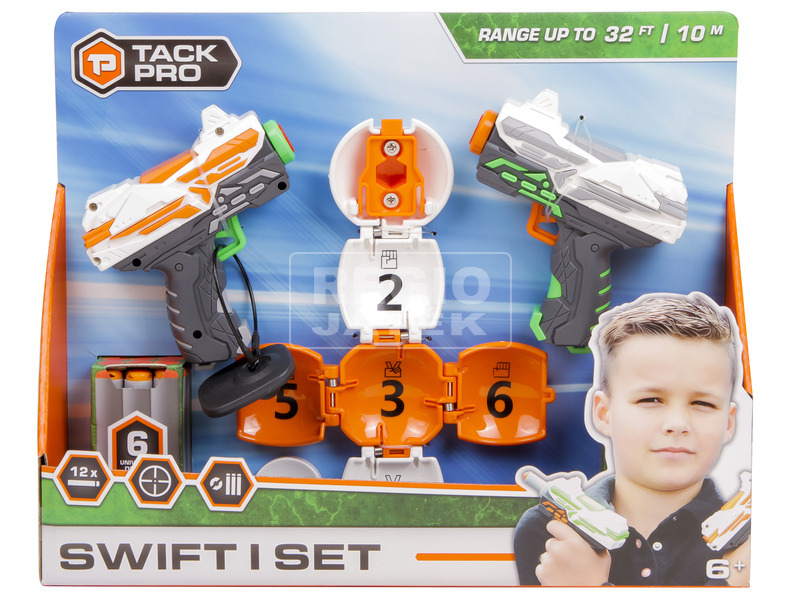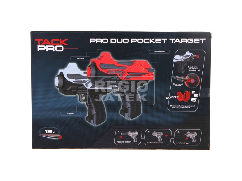Találjátok el a golyót minél többször a kis pisztolyokkal! A Tack Pro szivacslövő pisztoly készlet célponttal egy piros, és egy fehér kis fegyvert, valamint egy kinyitható golyót is tartalmaz, amivel gyakorolni tudjátok a célba lövést. A pisztolyok egylövetűek, minden lövéskor fel kell húzni, a golyó belseje több pontszámmal van jelölve. Minél többször találjátok el, annyival több pontot fogtok gyűjteni. A pisztoly akár 15 méterre is képes kilőni az ártalmatlan szivacsos lőszereket. A Tack Pro szivacslövő pisztoly készlet célponttal készlet 12 darab lőszert foglal magában. Pisztolyok mérete: 11 cm.