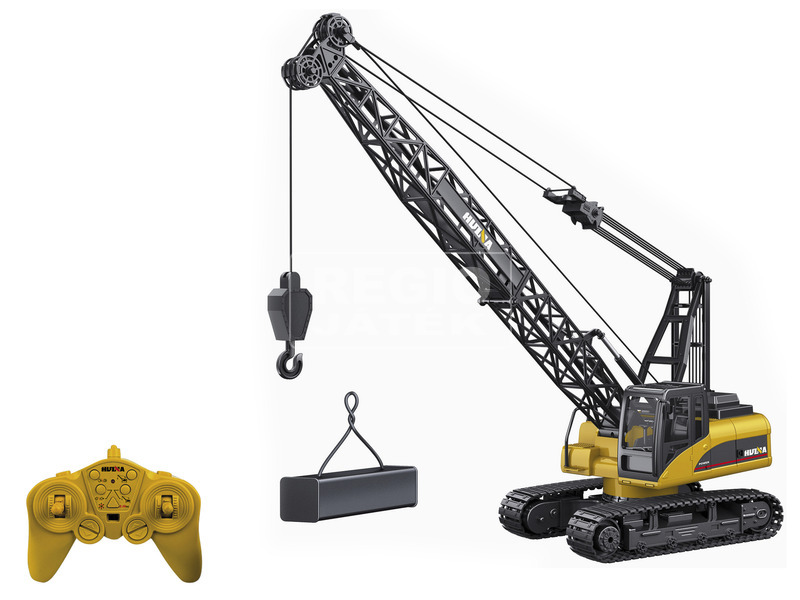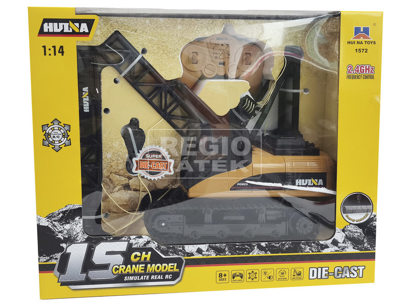 Építs te is felhőkarcolókat a lánctalpas fémből és ABS műanyagból készült valósághű 1:14 méretarányú Huina daruval. A távirányítóval kezelheted a daru emelőszerkezetét is. A markoló hang és fény effektekkel van felszerelve. A távirányító 2,4 GHz-es frekvencián és 15 csatornán működik. Hatótávolsága: 30-80 méter. A 7.2V 400mAh akkumulátor töltési ideje körülbelül 240 perc. A játékidő 20-30 perc.