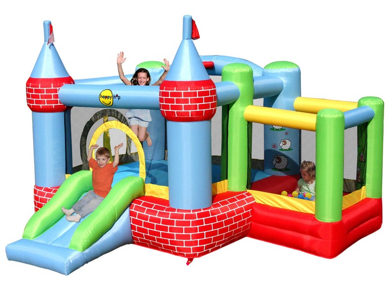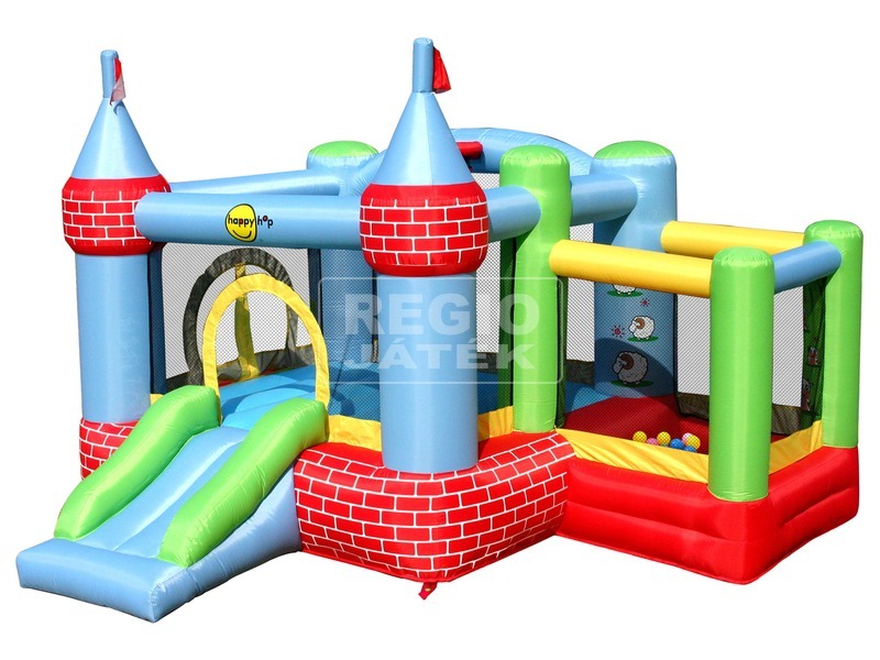 Kastély formájú ugárlóvár tornyokkal, és labda medencével! A Kastély ugrálóvár labdahálóval egy nagy méretű, erős PVC-ből készült vár, amiben több gyerek tud ugrálni, és játszani. Az ugrálóvárból csúszdán keresztül lehet kijutni, az oldalsó hálós részt kicsi labdákkal érdemes feltölteni, ami külön élményt nyújt a gyerekeknek. A kültéri Kastély ugrálóvár labdahálóval kompresszorral fújható fel, amit a készlet magában foglal. Az ugrálóvár felfújt méretei: 325 x 300 x 220 cm.