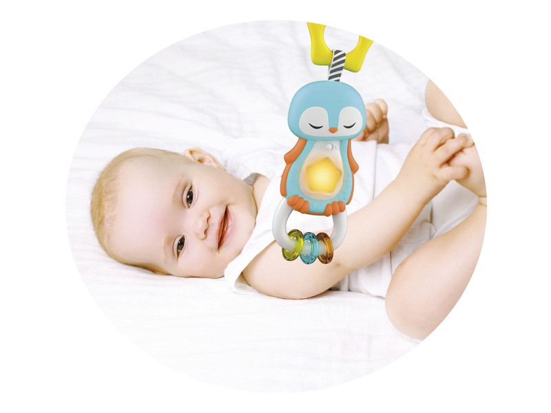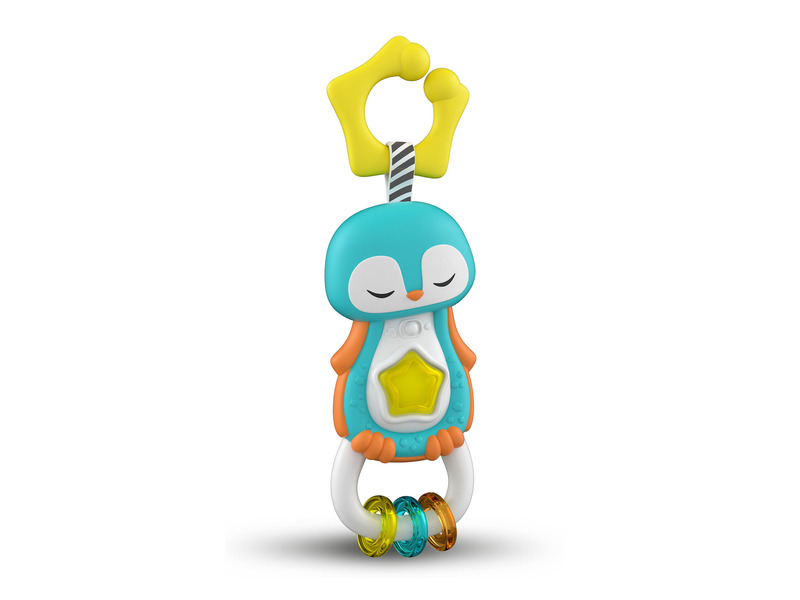 A cuki pingvin formájú csörgő, a szettben található akasztó segítségével a babakocsira vagy a kiságyra rögzíthető. A csörgő hang mellett egy gomb megnyomásával aktiválhatjuk a fény- és hangeffekt funkciót. A csörgőn három színes gyűrű is található.