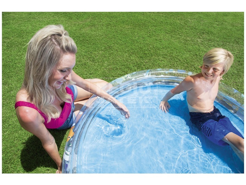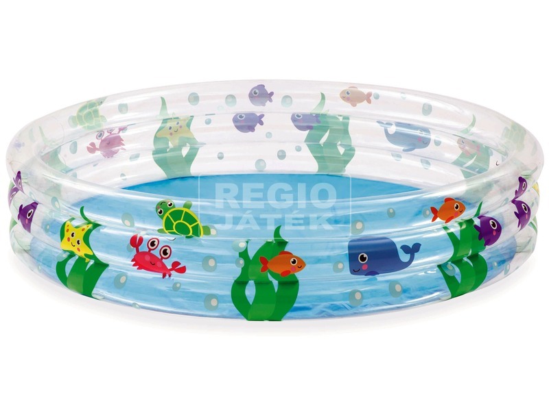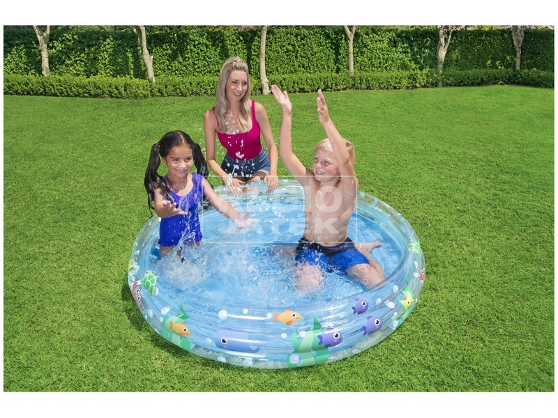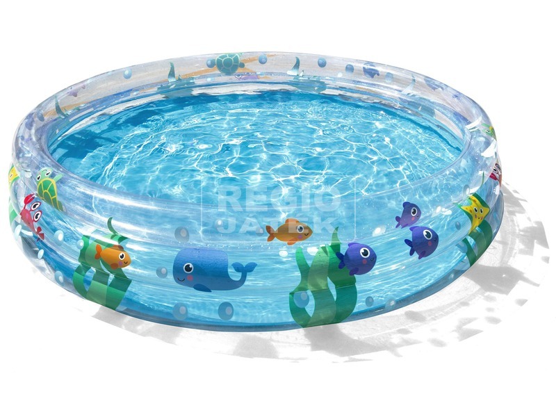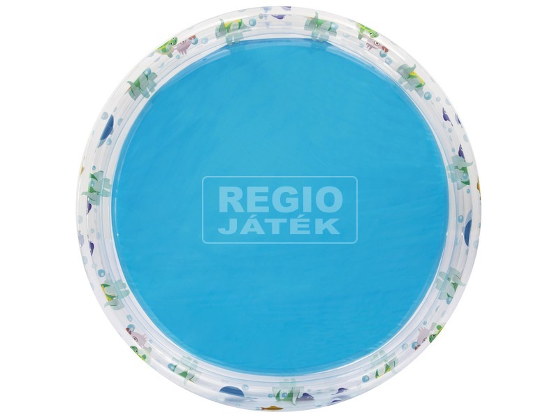 Strapabíró háromgyűrűs átlátszó medence! A medence nagyon erős műanyagból készült, egyszerre több gyerek is kényelmesen tud benne lubickolni. A felfújható háromgyűrűs medence biztonsági szeleppel van felszerelve, ha kiesik a dugója, akkor sem fog azonnal leereszteni. Felfújt méretek: 152 x 30 cm.