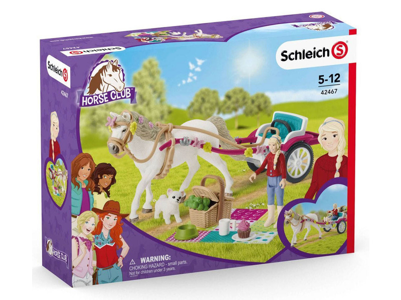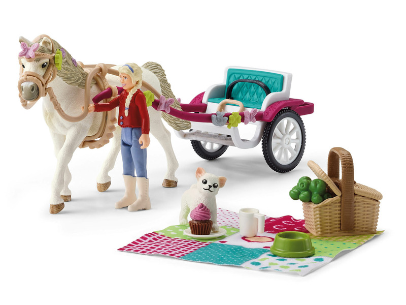 A Schleich® Horse Club termékcsaládhoz tartozó hintótd lóherék, patkók és pillangók díszítik. Clara a Connemara póni kantárját is gyönyörű díszítésekkel látta el. A praktikus polcon egy puha pikniktakaró és egy jól megrakott piknikkosár van. Clara kényelmesen leülhet a takaróra a lovasbemutató alatt, megölelheti csivava kiskutyáját, és élvezheti a piknikfalatokat. Méret: 24,5x6,6x19 cm