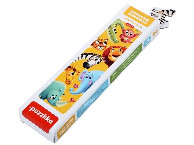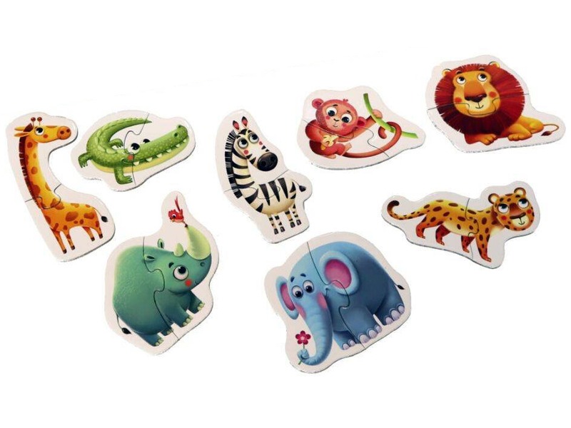 Rakj össze színes, Afrikában élő állatokat! Az Afrikai állatok 16 darabos puzzle elefántot, zebrát, oroszlánt, zsiráfot, krokodilt, leopárdot, orrszarvút és majmot tartalmaz, amiket 2-2 darab mozaikdarabból lehet összerakni. A kirakós kisebb gyerekeknek készült, és miközben játszanak, a kézügyességük, és a megfigyelésük is fejlődik. Az Afrikai állatok 16 darabos puzzle kirakott mérete: kb. 8 cm.