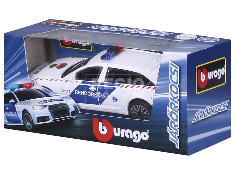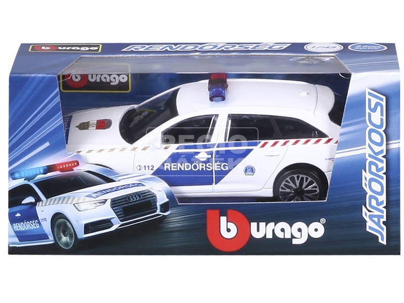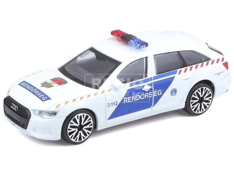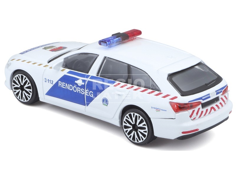 Fehér és kék színű rendőrautó, magyar Rendőrség felirattal! Az 1:43 méretarányú Bburago Audi A6 Avant magyar rendőrautó fémből és műanyagból készült autómodell. Az autó a Rendőrség felirattal és a 112 hívószámmal van díszítve, pont úgy néz ki, mint az igazi kombi Audi rendőrautók. Az autót együtt tudod használni bármilyen 1:43 méretarányú Bburago kisautóval is, de akár díszként is felteheted a polcodra, vagy az asztalodra. A Bburago Audi A6 Avant magyar rendőrautó mérete: kb. 14 cm.