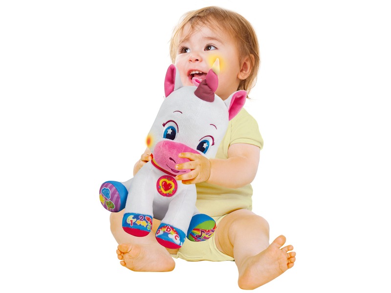 Aranyos plüss egyszarvú, öt interaktív gombbal. Számok, betűk, formák és színek játszva tanulásában remek partner. Taníts új szavakat a kicsinek varázslatos dalok és vidám mondókák segítségével. Az interaktív gombok az unikornis mancsain helyezkednek el. Az egyszarvú arca és szarva világít.
