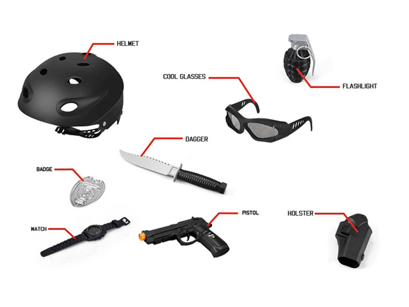 Kommandós fegyverszett Legyél Te is kommandós! A műanyag játékfegyverekkel sarokba szoríthatod a bűnözőket! Minden kis srác szereti az akció játékokat, így ez nekik tökéletes választás lesz. Beöltözhetnek a Barátaikkal, s a szabadban már mehet is a csata. A szett tartalma: sisak, gránát, jelvény, pisztoly, pisztolytáska, kés, szemüveg, óra. 3 éves kortól ajánlott