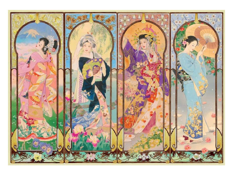 A Ravensburger 1000 db-os puzzle - A négy évszak című képén a japán gésák mindegyike más-más évszakot képvisel ruhájával és környezetével is.