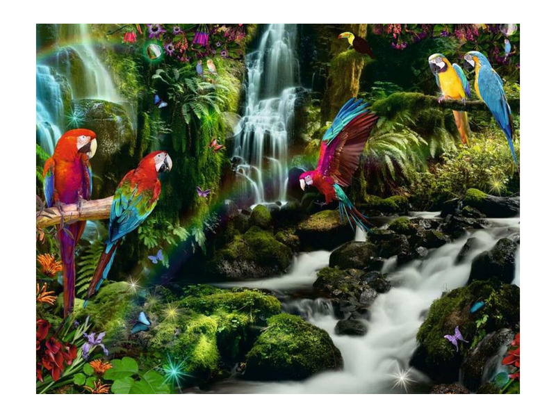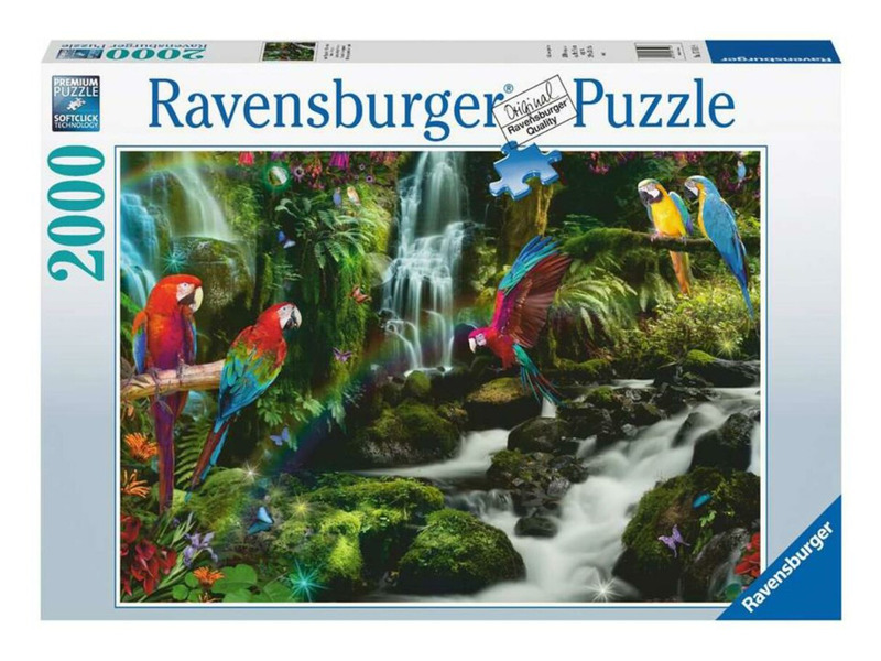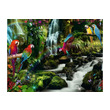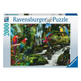 A Ravensburger 2000 db-os puzzle - Színes papagájok a dzsungelben című képén a sárga-kék ara és a zöldszárnyú ara papagáj látható.