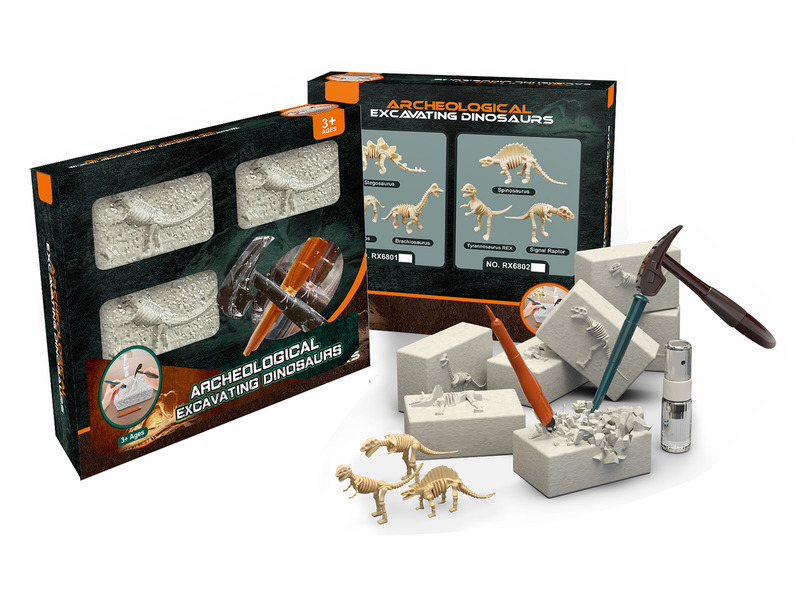 Régész szett - dínók A gipsz domborművön egy dínócsontvázat láthatsz. Régészeti módszerekkel feltárhatod a benne található meglepetés fosszíliát. Óvatosan használd a vésőt és a kalapácsot, nehogy megsérüljenek az értékes leletek.Dínó kedvelő gyerekeknek, ez a játék nagy élményt fog nyújtani. A szett tartalma: 3 db gipsz dombormű, 1 db ecset, 1 db műanyag régészkalapács, 1 db műanyag véső. 3 éves kortól ajánlott