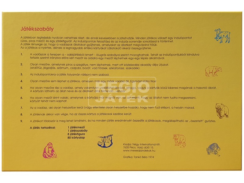 Minden játékos választ egy indulópontot és játékfigurát. A játék lényege, hogy a vadászok az állatkert részére állatokat gyűjtenek, amelyeket az állatkert megvásárol tőlük. Különböző pontértékek tartoznak az állatokhoz. Az állatokat csak lólépésben lehet megközelíteni. Ha egy vadállathoz ért egy vadász, vagyis elfogja, akkor az állatos kártyák közül kikeresi magának a megfelelőt. A kártyán szerepel az állat neve, illetve az állatkert által térítendő vételár is. Tetszés szerinti irányban - de csakis lóugrásban - mozoghatnak a vadászok. Másik vadászt nem szabad kiütni. De vigyázat, nem lehet minden kockára lépni: nehogy csapdába ess, kerüld ki a bozótost, az erdőtüzet, vigyázz a vad törzsekkel... ! A játéknak akkor van vége, amikor valamennyi kártya a játékosoknál van. A játékot az a vadász nyeri, aki a legtöbb pontot vadássza össze. A doboz tartalma: - 1 db játékmező - 8 db játékfigura - 80 db kártyalap. Ajánlott: 5 éves kortól. 2-8 játékos részére.