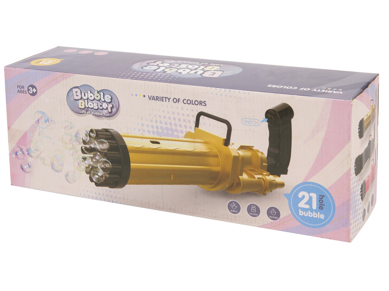 21 lyuku sorozatlövő buborékfújó 6 színben elérhető : átlátszó rózsaszín, átlátszó sárga, átlátszó kék, arany, fekete, rózsaszín. Kérjük, hogy a megjegyzésbe tüntesse fel, hogy melyik színt kéri. Legyél te a vízicsaták ünnepelt hőse! Ezzel a 21 lyukú buborékfújó sorozatlövő géppel könnyű dolgod lesz! Nincs más dolgod, mint megnyomni a gombot és élvezettel figyelni, ahogy a sok apró buborék a levegőbe repül. 4 db 2A elemmel müködik, amit nem tartalmaz a csomag.