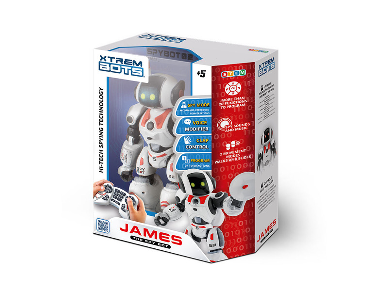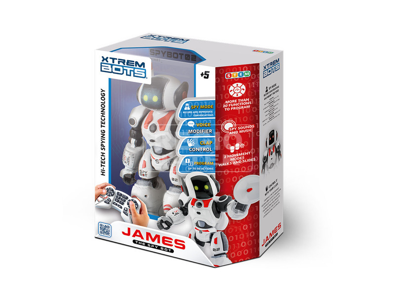 Több, mint 50 programozható akciója és több mint 20 funkciója van. Különféle hangjai és fényei megállíthatatlanná teszik. Aktiváld a James-The Spy Botot egy titkos kommunikációs rendszeren keresztül tapsolással: egy taps, két taps, ... te döntöd el! Ez a te titkos kódod! Kémmódja lehetővé teszi a beszélgetések rögzítését. James-The Spy Bot szórakoztató módon játssza le azokat, tudja módosítani a hangot, és létezik zenei és táncos módja is.