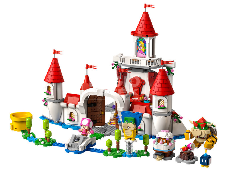 A Peach kastélya kiegészítő szettel (71408) a gyerekek egy ikonikus helyszínnel egészíthetik ki LEGO® Super Mario™ univerzumukat. A játékosokra rengeteg felfedeznivaló vár, emellett interaktív LEGO® Mario™, LEGO® Luigi™ vagy LEGO® Peach™ figurájukkal (a szett nem tartalmazza) számos módon nyerhetnek digitális érméket. A készlet egy tróntermet tartalmaz forgatható fallal, ami Bowsert rejti, emellett egy Peach-et ábrázoló ablaküveget, egy interaktív elemmel ellátott Bob-omb festményt, egy Goombát rejtő tortát, egy Peach kastélya különleges csövet, Időkockát, „leszakadt” hidat, egy lila gyümölcsöt tartalmazó gyümölcstálat és sok minden mást is találsz. (Megjegyzés: a 71360, 71387 vagy 71403 kezdőpálya szükséges az interaktív játékhoz.)