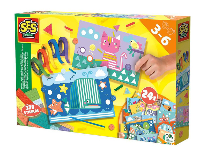 Háromszög ide, kör oda! Ezzel a fantasztikus készlettel tanulhatsz meg formákat ragasztani. A kicsik kreatívan, játékosan közelíthetik meg a különböző formákat és a ragasztás témáját. 24 aranyos kép színes állatmotívumokkal már csak arra vár, hogy elkészüljön matricákkal. A kép motívumától függően kör, háromszög vagy csík formájú területeket vágnak ki, amelyekre pontosan illeszkednek a megfelelő matricák. A macska sárga vagy kék szőrcsíkokat kap? És melyik forma illik pontosan ebbe a tengeri csillagba? Így matricáról matricára teljesedik ki az izgalmas motívum. Az élénk színű ragasztási móka mellett a kicsik fejlesztik a formák és színek megértését, játékosan erősítik a szem-kéz koordinációt és a finommotorikát. A készlet 5 tekercs színes szalagot, 370 matricát és 24 kézműves kártyát tartalmaz.