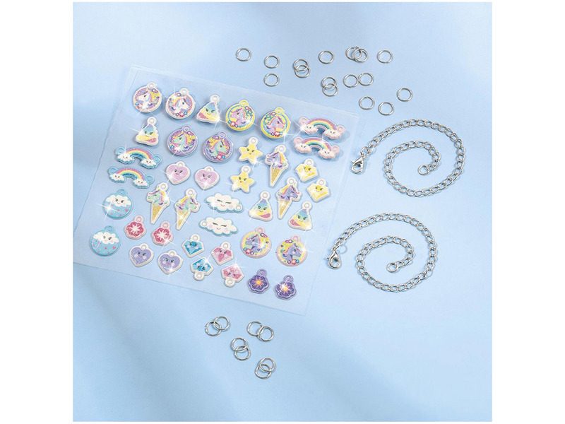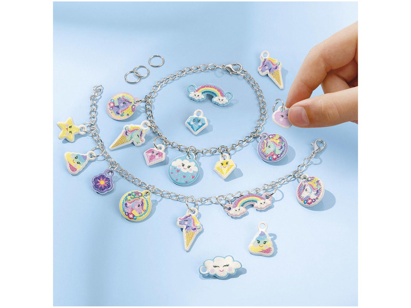 Karkötőkészítő Egyedi karkötőket készíthetsz, amelyekre mindenki féltékeny lesz! Vedd elő a neked legjobban tetsző charm-kat, és fűzd fel őket a láncra, hogy a karkötőd olyan legyen, amilyet szeretnél! A készlet 20 különböző függő díszt és két láncot tartalmaz . 3 éves kortól ajánlott
