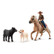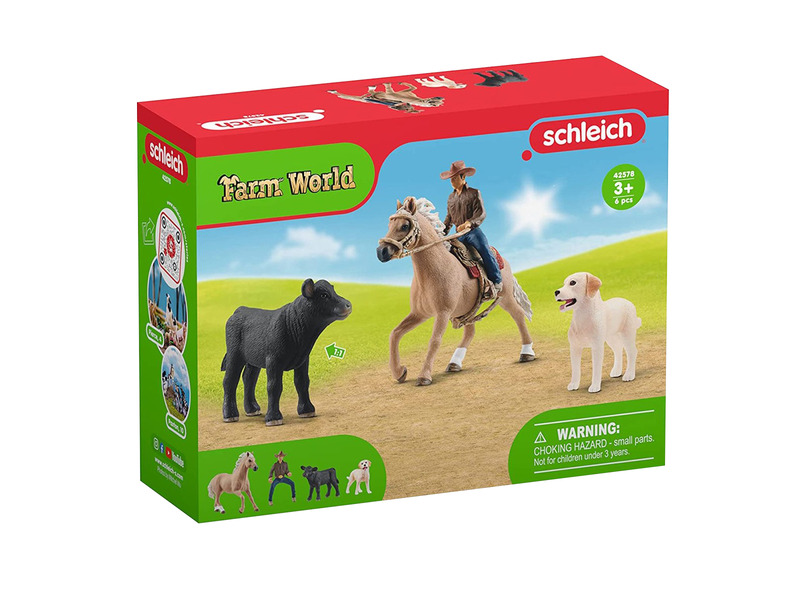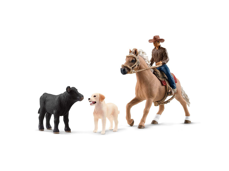 A német Schleich játékgyártó változatos tematikus világaival, élethűen és részletesen kidolgozott figuráival nemcsak a gyerekek fantáziáját mozgatja meg és kreativitását ösztönzi, de segíti fejlődésüket is. Céljuk, hogy izgalmas és nevelési szempontból is értékes játékkoncepciókat biztosítsanak a gyerekeknek, korosztálytól és érdeklődési körtől függetlenül. Filozófiájuk: játssz, érezz, tapasztalj! A Schleich figurák mindegyike kiváló minőségű, részletgazdag és egyedi készítésű, melyeket nagy odaadással, kézzel festenek meg. Az élethű kivitelezésű Schleich állatfigurák segítségével a gyerekek megtanulhatják, hogyan néznek ki az állatok és élőhelyeik a valóságban, és hogyan bánhatnak az emberek felelősen a természettel. A Schleich Farm World figuráival és készleteivel a gyerekek a tanyavilág, állattartás és gazdálkodás világába kóstolhatnak bele. Egy farmon soha nincs unalmas pillanat! A cowboy-nak sok dolga van a tanyán, megbízható kutyája pedig mindig készen áll, hogy segítsen gazdájának. A cowboy gyönyörű paripájával sebesen vágtat a kis borjú után, aki elszökött a csordától, Labrador kutyája pedig segít visszaterelni a kicsit a mamájához. Ragadd meg a gyeplőt Te is és keresd meg a legjobb kalandokat a farmon! A játékszett tartalma: 1 db Quarter Horse ló figura, 1 db cowboy figura, 1 db western nyereg, 1 db kantár és gyeplő, 1 db Labrador szuka kutya figura, 1 db Black Angus borjú figura