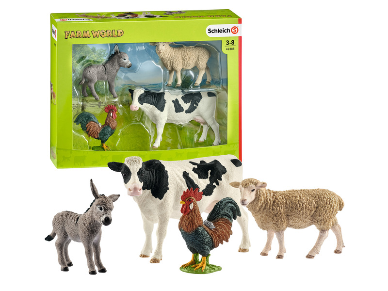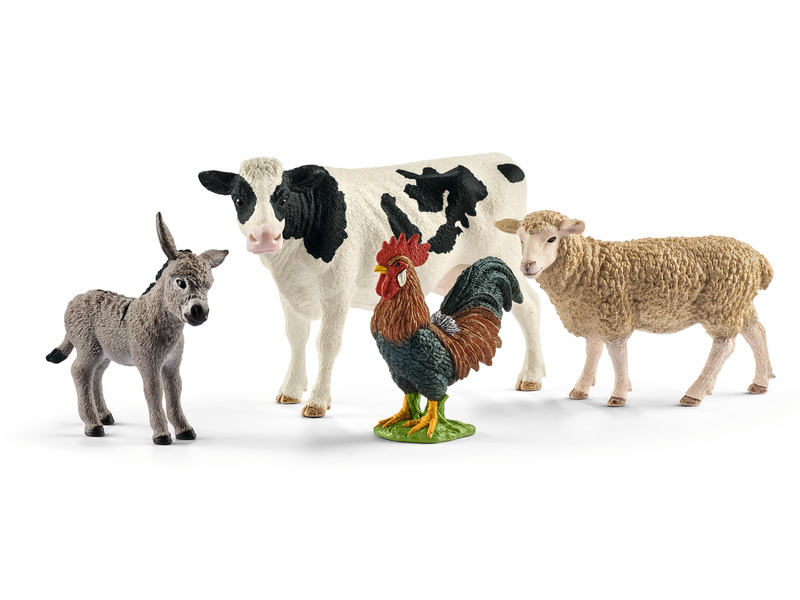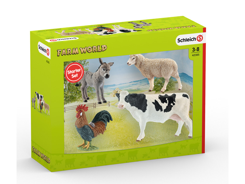 A Schleich Farm World figuráival és készleteivel a gyerekek a tanyavilág, állattartás és gazdálkodás világába kóstolhatnak bele. Egy farmon soha nincs unalmas pillanat! Ezzel a kezdőkészlettel a gyermekek megismerkedhetnek a legnépszerűbb farmon élő haszonállatokkal. A tehén, a szamár, a bárány és a kakas már csak a gyermekek legújabb történetére vár, mellyel egy csodás nap kezdődhet a farmon. A játékszett tartalma: 1 db tehén figura, 1 db szamár figura, 1 db bárány figura, 1 db kakas figura. Doboz méret 24,5 x 19 x 8 cm.
