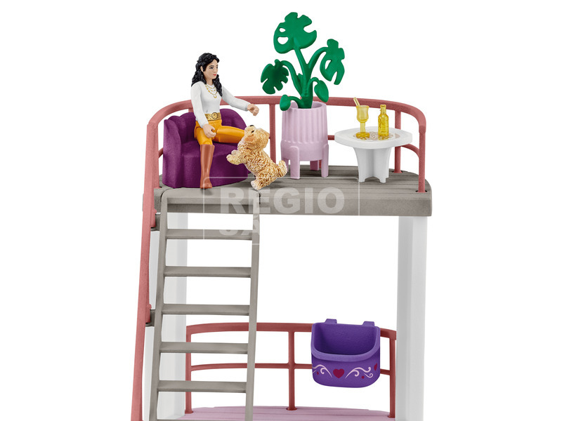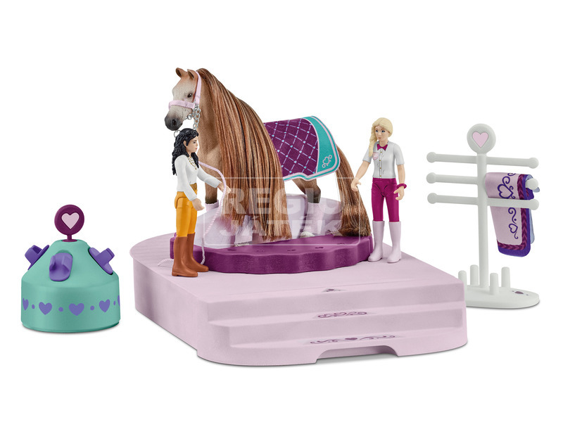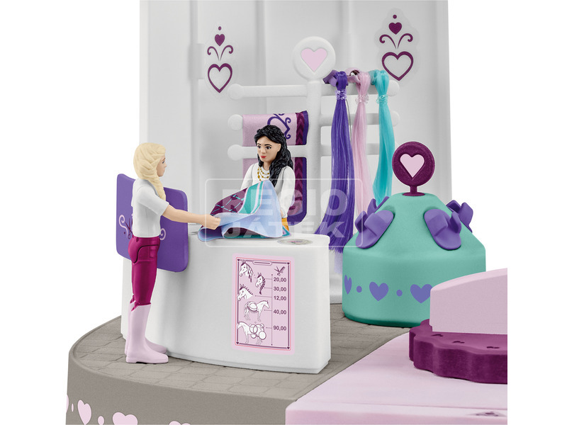 A Schleich Horse Club Sofia',s Beauties Salon De Beauté-ban minden megtalálható, amire csak egy lovacska vágyhat. Legyen szó születésnapi meglepetésről, istállópartiról vagy kis csikók képzéséről, a lehetőségek csak a fantáziára vannak bízva. A szépségszalonban egy ruhaműhely is megtalálható, így minden tartozék és kiegészítő méretre készül. Az épület kétemeletes, a földszinten lévő fiókban apró díszítő elemek, gyöngyök és klipek is megtalálhatók. A lófarkak kifésülhetők, illetve kicserélhetők. A váróteremben mindenki élvezheti a kiszolgálást, hiszen a lovaknak friss széna, a lovasoknak pedig friss limonádé áll rendelkezésükre. A Schleich figurákat kifejezetten pici kezekre tervezték, remekül fejleszti a kreativitást és a képzelőerőt. A játék biztonságos, jó minőségű gumi-műanyag ötvözetből készült.