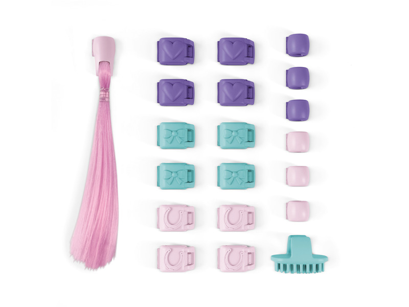 Ezzel a sörénydíszítő szettel igazán egyedivé varázsolhatók a lovak. Legyen szó versenyről vagy bemutatóról, ez a lila-rózsaszín árnyalatú sörény csat és póttincs szett tökéletes választás lesz. A kiegészítők tökéletesen illeszkednek a (külön kapható) Schleich lovakra.